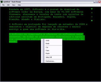 Ao executar o Dark Room você tem a sensação de estar em frente a uma máquina da década de 1980. A tela negra aparece no monitor e ao escrever surgem os clássicos caracteres verdes. Cópias automáticas